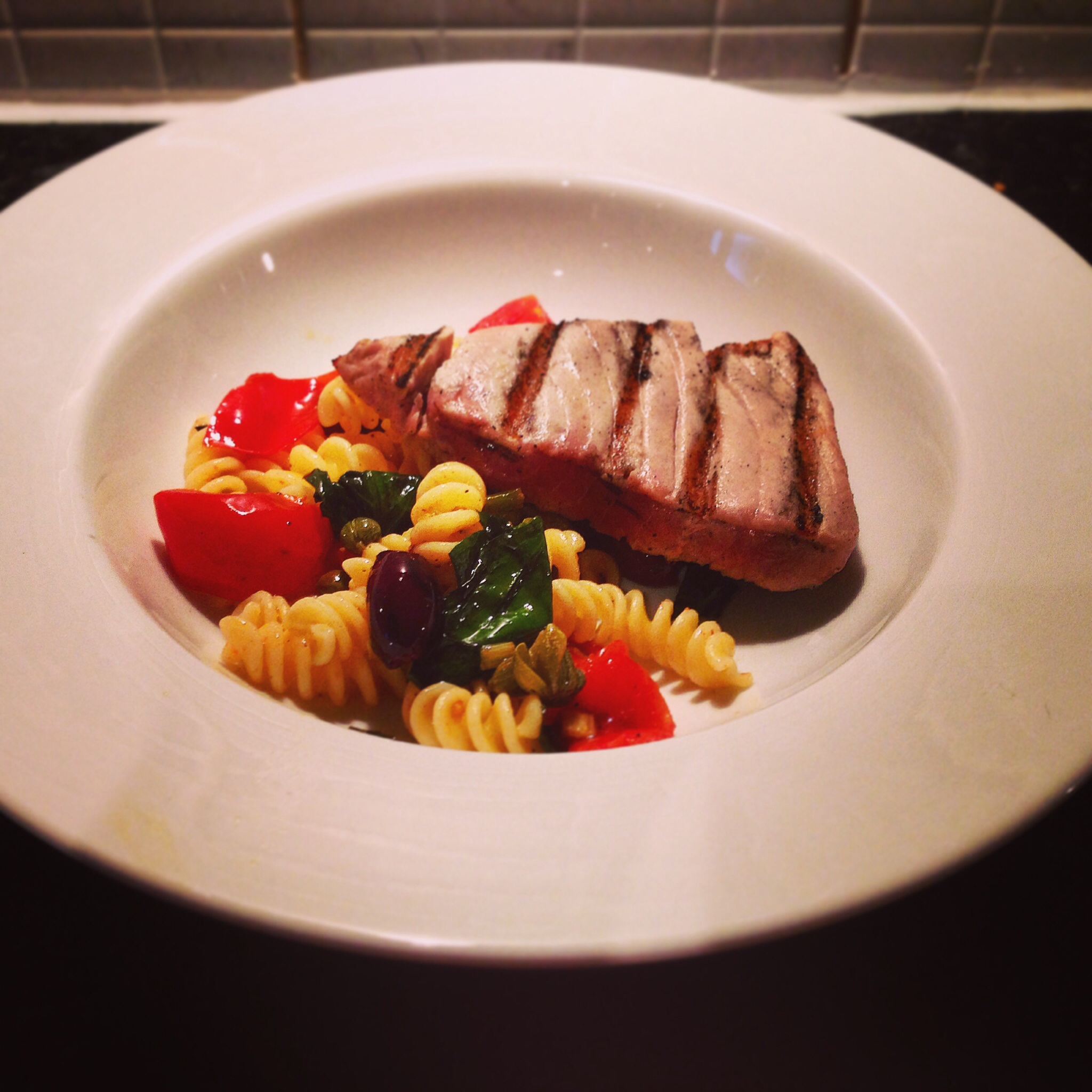 Add the oil to a frying pan, along with the onions. Fry these gently, not allowing them to become too coloured (you want sweetness not bitter dark onions), this should take 5-8 minutes, then add the tomatoes, olives and capers, and cook for a further 10 minutes until the chunky sauce has come together a little and warmed through. Once off the heat, season with black pepper and add some torn basil leaves and a squeeze of lemon juice. Add the cooked and drained pasta to the sauce and stir well. Serve with the tuna steak on top. Easy peasy lemon squeezy (easy on the lemon though, it’s just meant to lift the sauce a little).