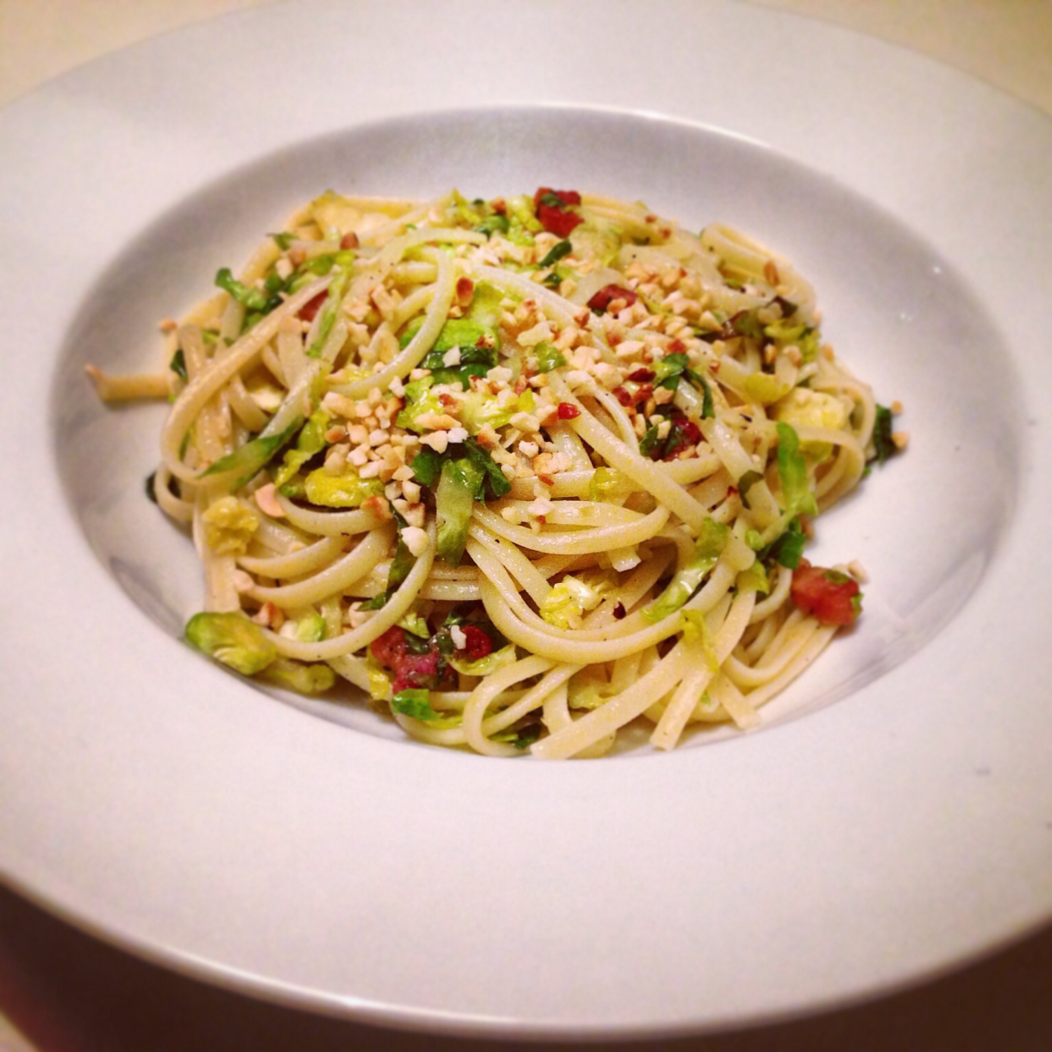 I tossed the vegetable mix through al dente linguine, to create a light dinner- made a bit special with a topping of toasted hazelnuts and parmesan, but this would be equally good, minus the linguine, as a sprouty side dish to some simply prepared fish or chicken.