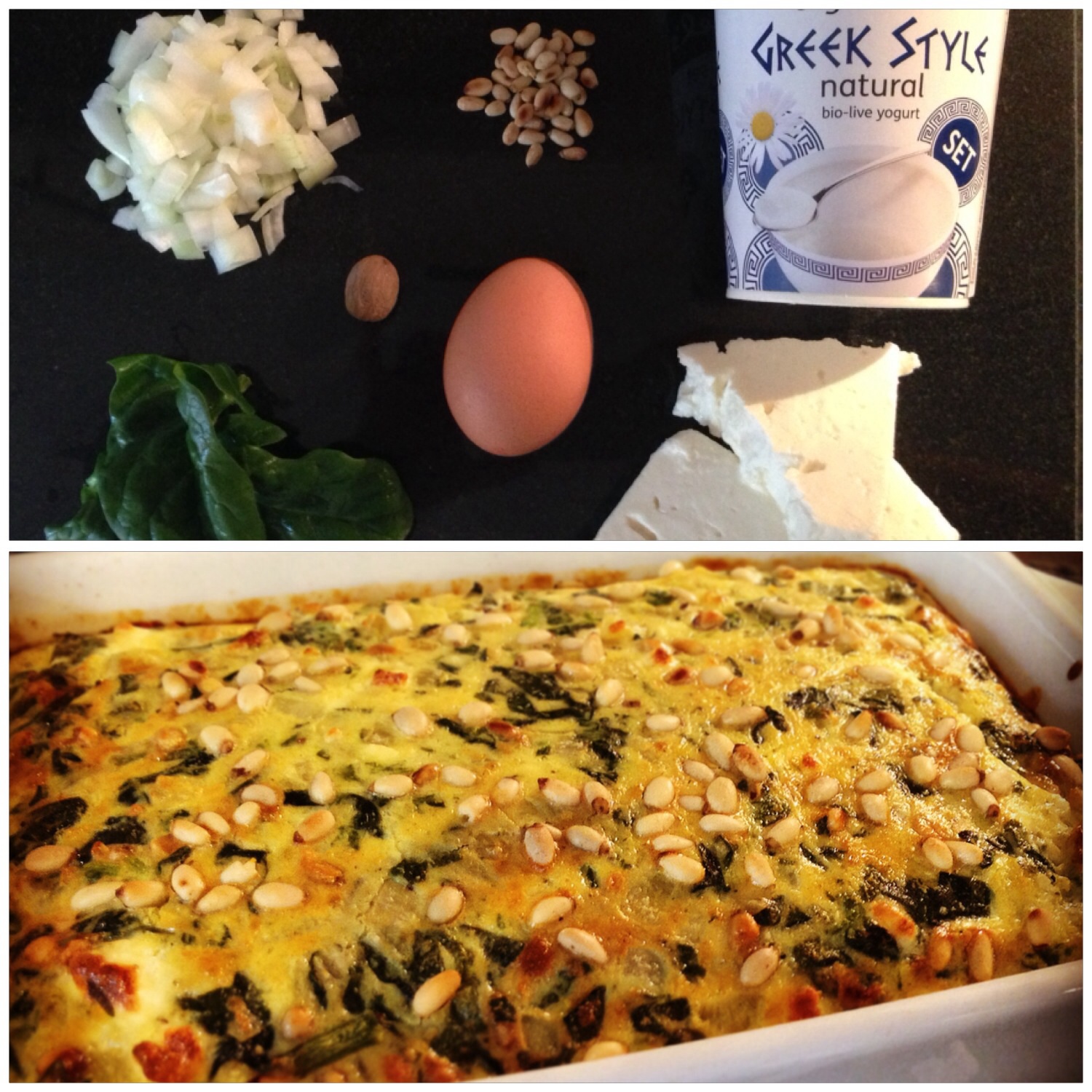 In a mixing bowl, mix the eggs, yogurt, feta and 50g of the Pinenuts, adding the spinach and onion last. Mix thoroughly and season with grated nutmeg and black pepper.